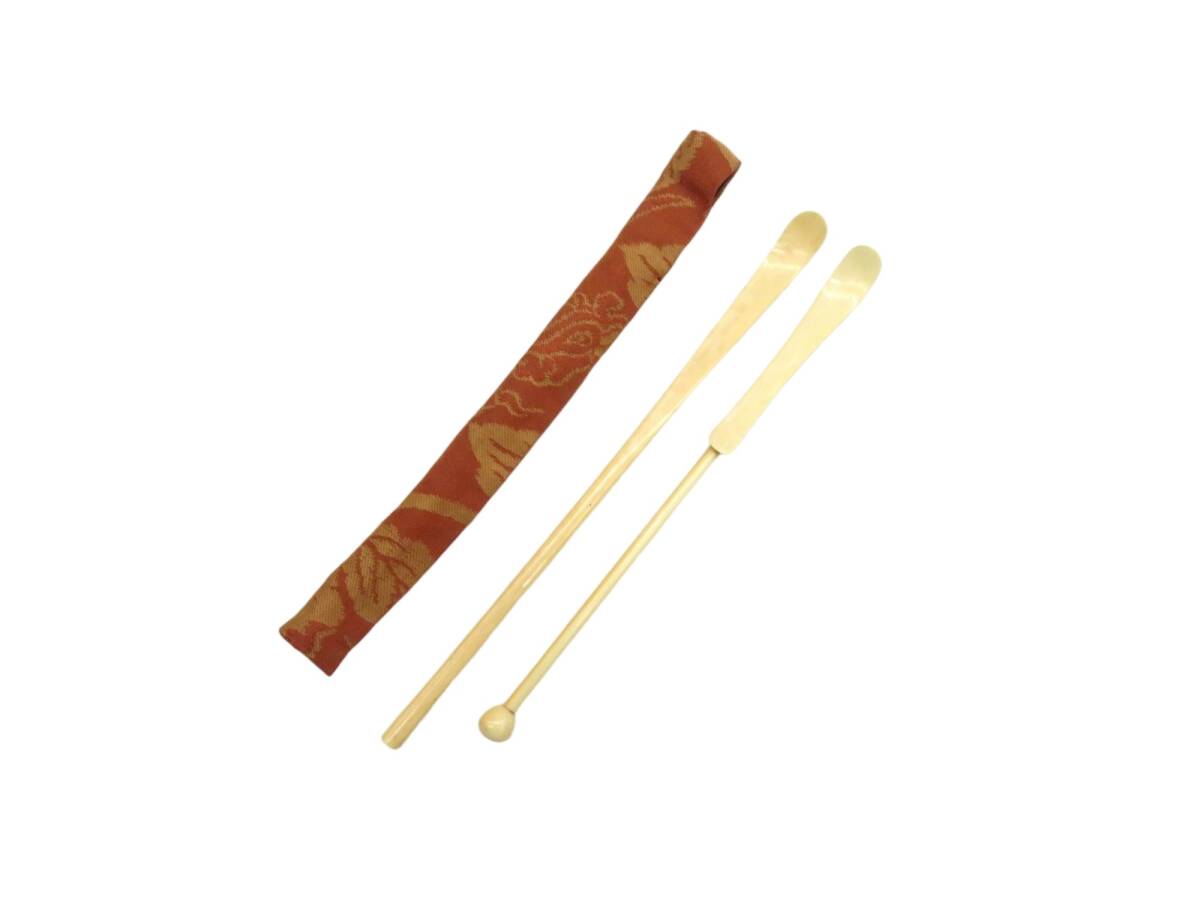 > K8896 茶杓 茶匙 2点 特殊材料 仕覆 時代物 古美術 茶道具 煎茶道具 鉄瓶 サイズ ①長さ約18.4cm ②長さ約16.7cm