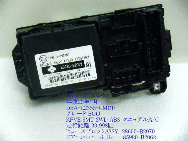 - ◆L235S ダイハツ エッセ H23年 ヒューズボックス 28600-B2070 ドアコントロールリレー 85980-B2062 30,998㎞ [14269]