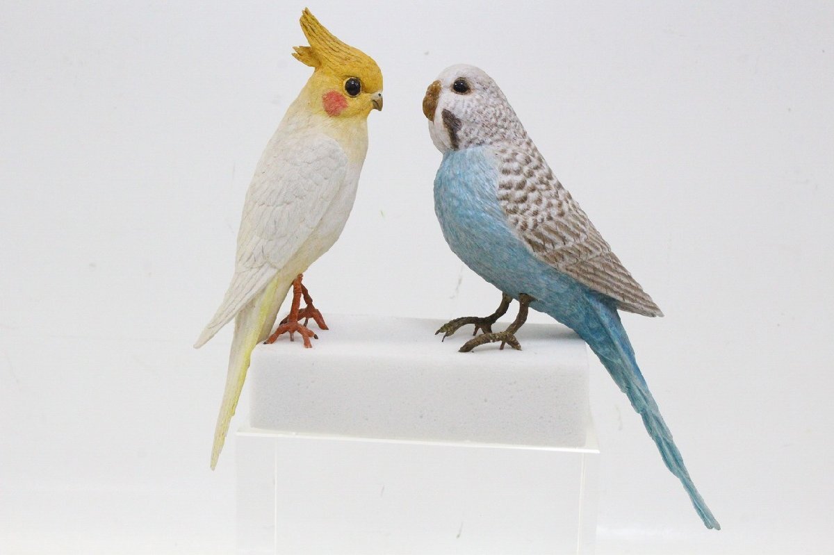 - バードカービング オカメインコ セキセイインコ 2点 まとめ 木彫 ハンドメイド 11-K028