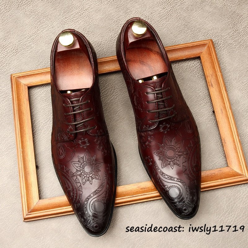 - 定価11万超★最高級 ビジネスシューズ 本革 レザーシューズ 超希少 職人手作り 総柄 牛革 紳士靴 メンズ フォーマル 革靴 レッド 25.5cm