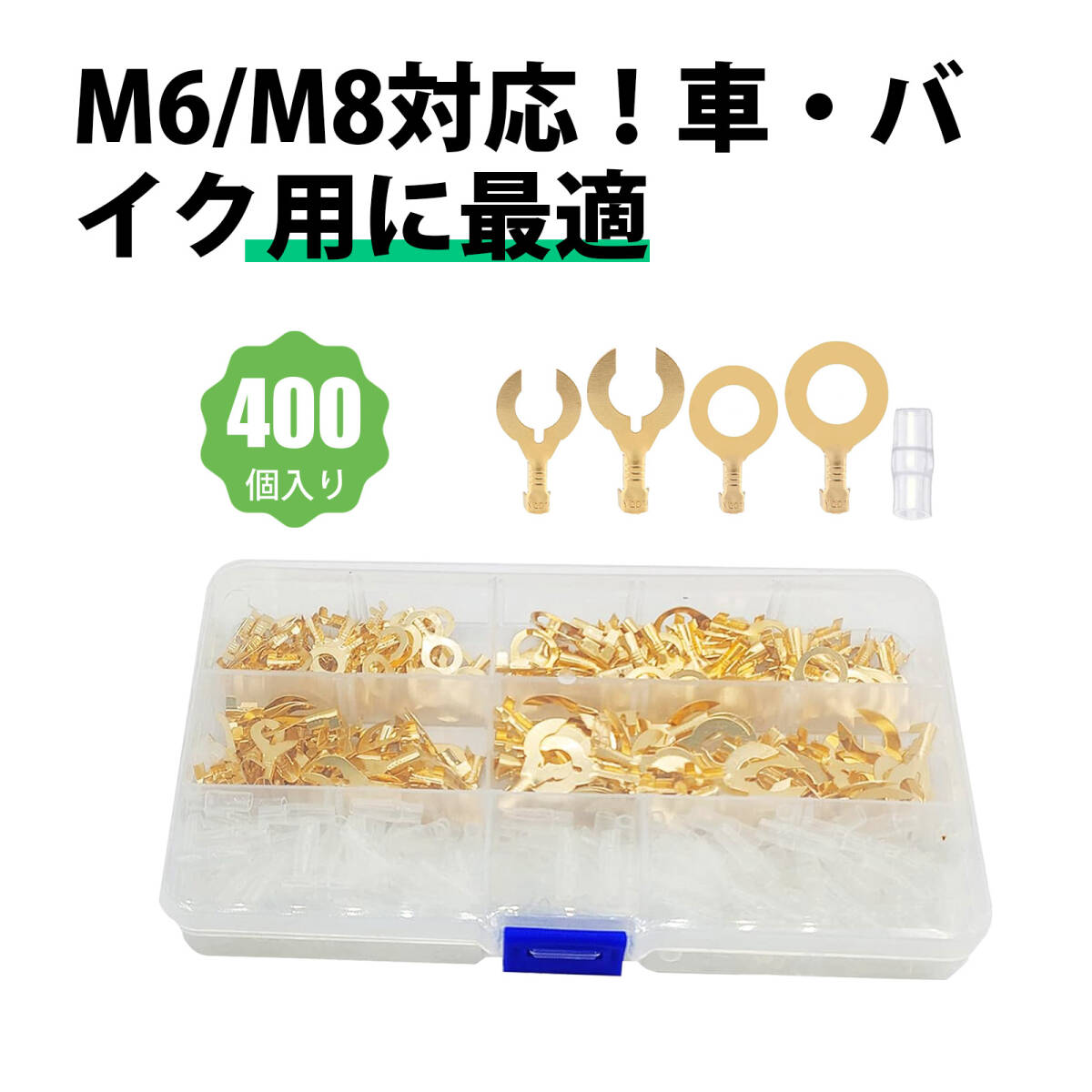 - 【400個入り】端子 端子セット スプライス端子 クワ型 丸型 端子セット M6/M8 全銅製 蟹足圧着端子 接地端子セット 絶縁カバー付き ;J7907;