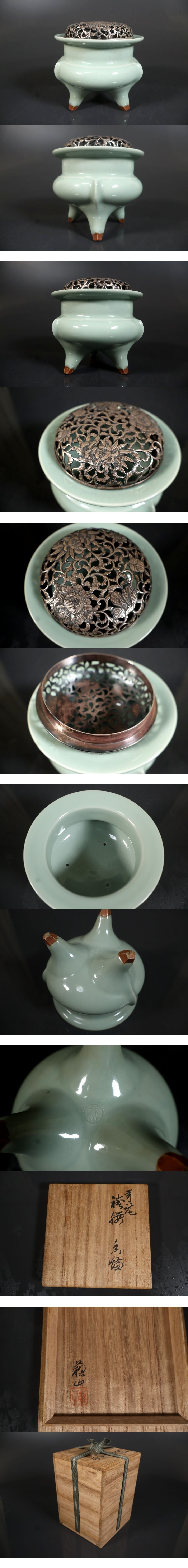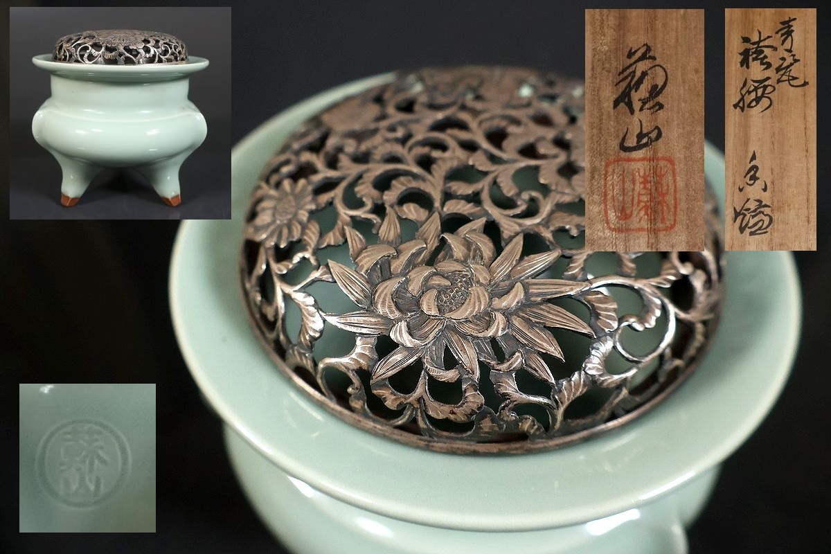 - 【小】5366 真作保証 諏訪蘇山作 青磁袴腰香炉 銀製火屋有 共箱有 茶道具 唐物倣