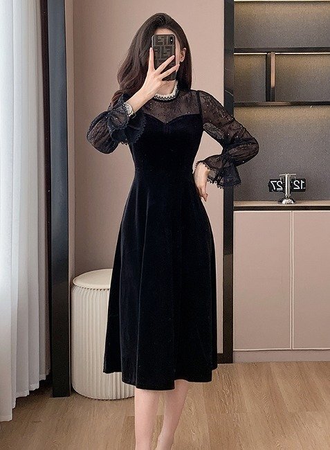 - ワンピース チュール フリル 切り替え スリム 着痩せ sweet系 S ブラック