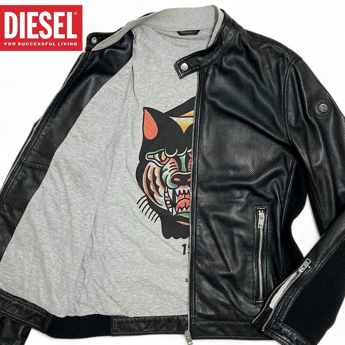 > 極美品●L ディーゼル メンズ シープスキン ライダースジャケット 全面パンチング加工 裏地プリント サイドリブ 肩ロゴ DIESEL ラムレザー