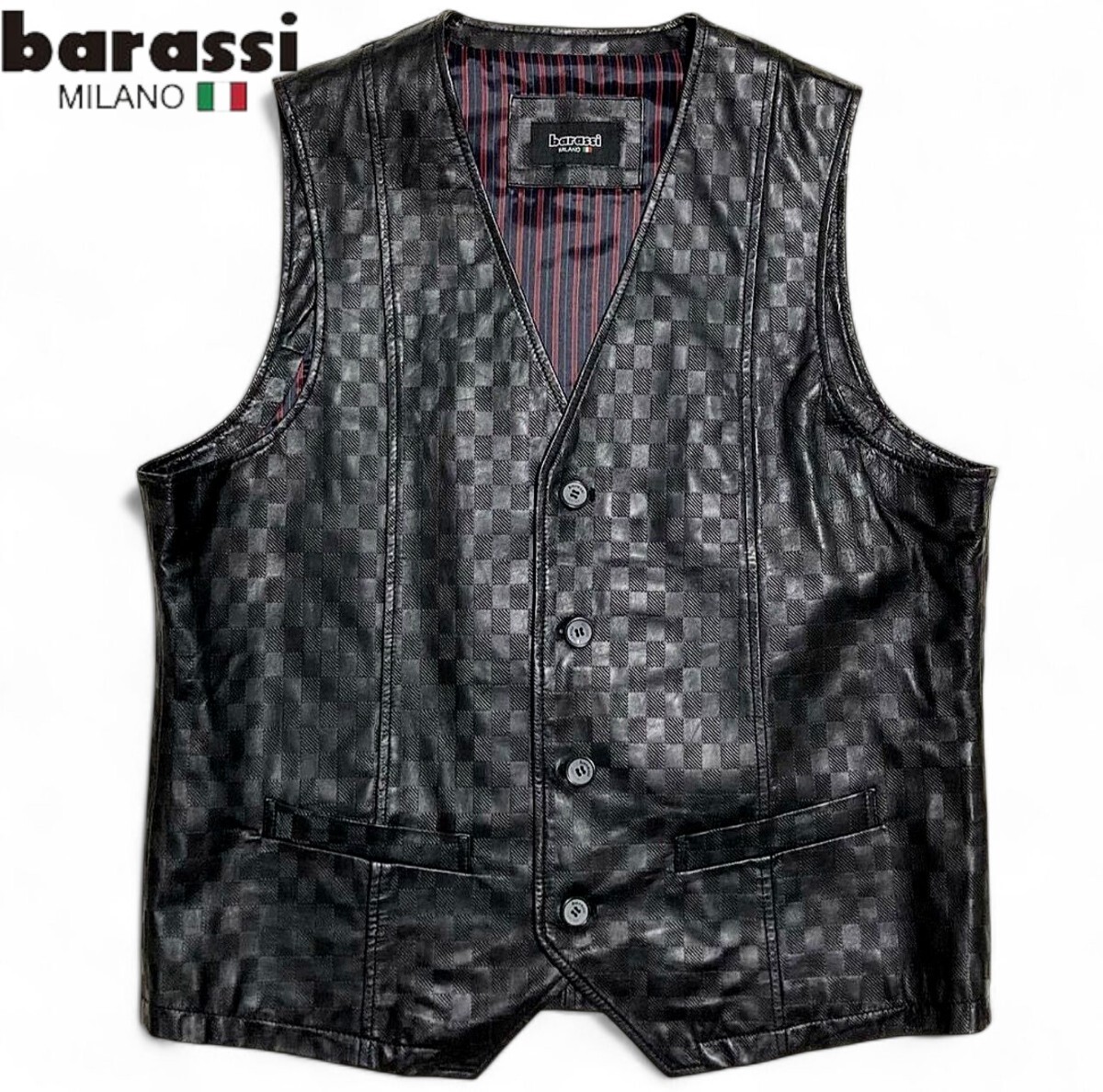 > 極美品●XL barassi メンズ レザーベストラムレザー エンボス スクエアパターン 裏地 ジレ バラシ ブロックチェック 格子柄 本革 黒 50