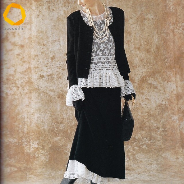 > #au カネコイサオ KANEKO ISAO セットアップ 黒 レース ブラウス・インナースカート・ネックレス付き カタログ掲載 2001年 [970932] k01