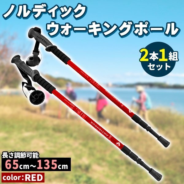 - 送料無料トレッキングポール 2本 アルミ製 アンチショック機能付 ステッキ 杖 スティック トレッキング ウォーキング ノルディック 登山 赤