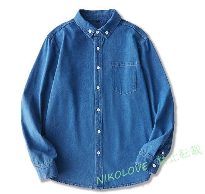 > 新品 デニムシャツ メンズ長袖シャツ 無地 綿生地 シンプル 紳士服 ワークシャツ トップス カジュアル ブルー/L 3XL