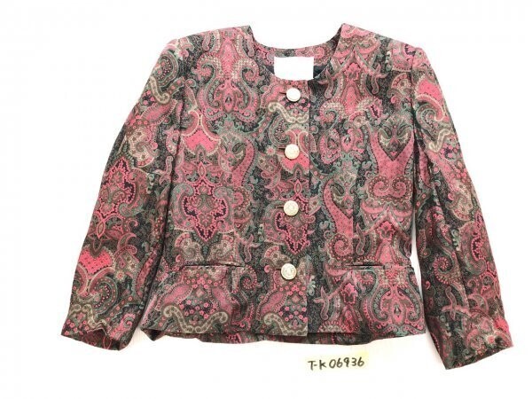 - SEVELINE レディース ペイズリー柄 シルクウール ノーカラージャケット 秋冬 9 黒赤カーキ 肩パッド入