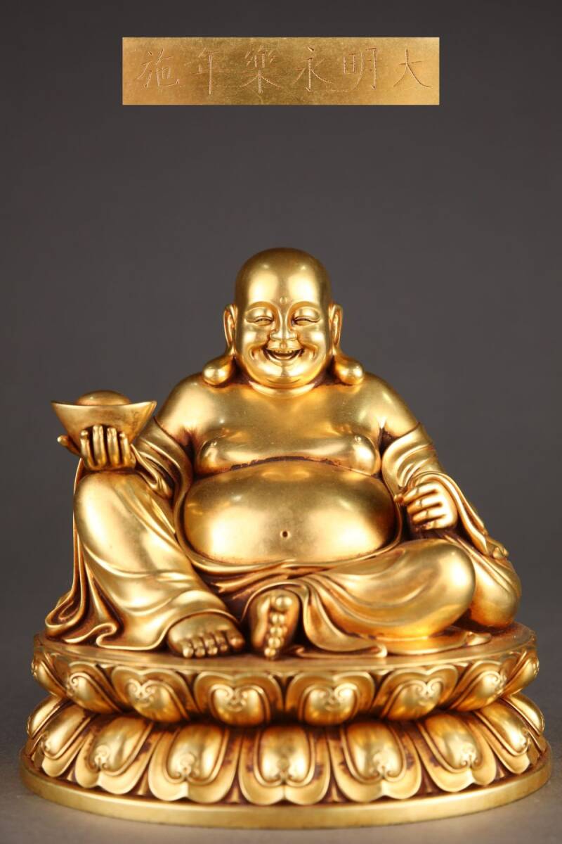 - 永し 明時代 大明永樂年施 紫銅塗金 彌勒佛 佛像 仏像 宗教 仏教古美術 極細工 古銅彫 置物擺件 古美術品 時代物 古董品 旧家蔵出 中国唐物