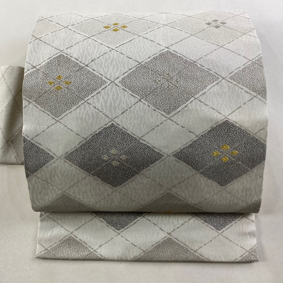 - 【美品】 名古屋帯 優品 斜め格子 菱 金銀糸 唐織 灰白 正絹 【中古】