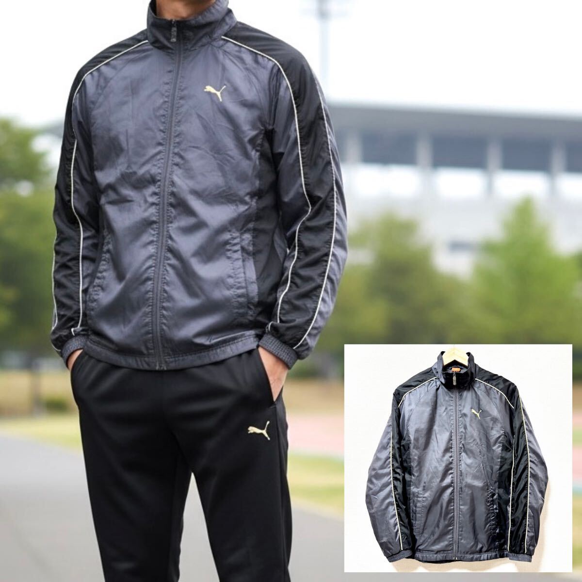 - ウォームアップにおすすめ!【PUMA】プーマ ウインドブレーカー ジャンパー ロゴ ランニング スポーツ 防寒 グレー メンズ M /Y38198SS
