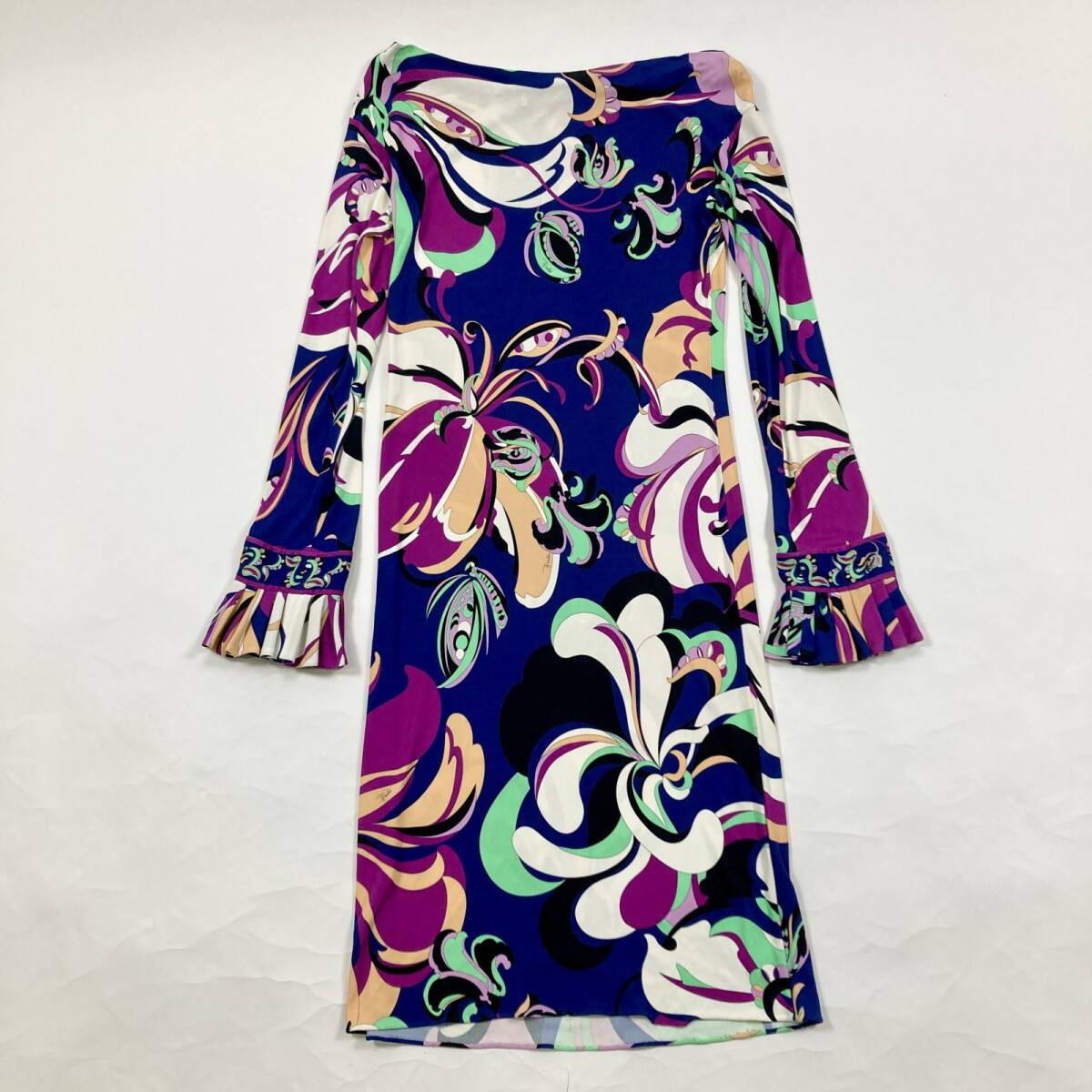 > ☆ Emilio Pucci エミリオプッチ ワンピース 長袖 ミモレ丈 幾何学模様 袖口プリーツ イタリア製 マルチカラー サイズ40 レディース 0.25kg