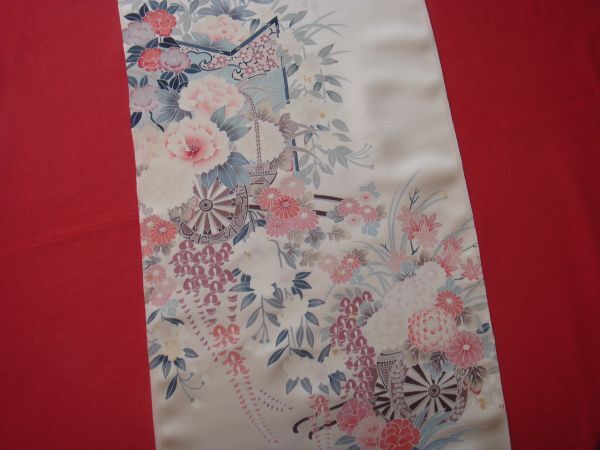 - ★ざ*きもの★ 訳有り! 京西陣 高級 付下げ 正絹 小さなシミ有り! 御所車に花