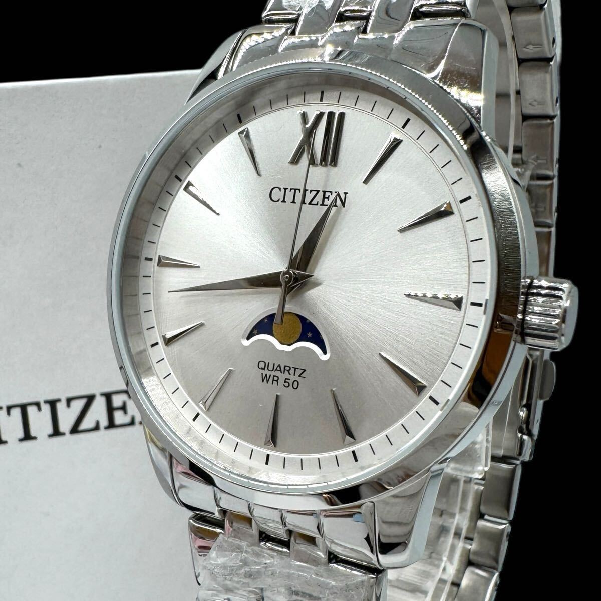 - 稼働 未使用品 CITIZEN シチズン 腕時計 メンズ クオーツ QZ アナログ 3針 ムーンフェイズ SS シルバー AK5000-54A 付属品有り【c2901】
