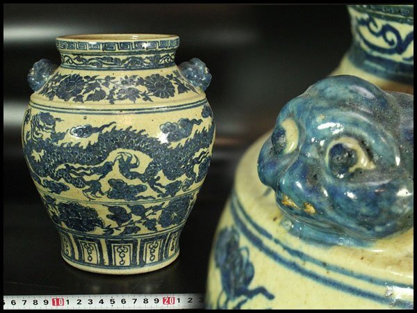 > 【金閣】中国美術 青華 纏枝霊芝雲龍紋 獣耳罐 瓶 旧家蔵出 送料無料(MB253)