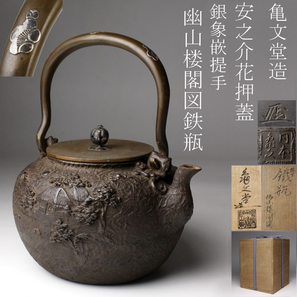 - 【LIG】亀文堂造 名人 安之介花押蓋 銀象嵌松竹梅紋提手 幽山楼閣図鉄瓶 茶道具 共箱 茶家収蔵品 [.QQP]25.8
