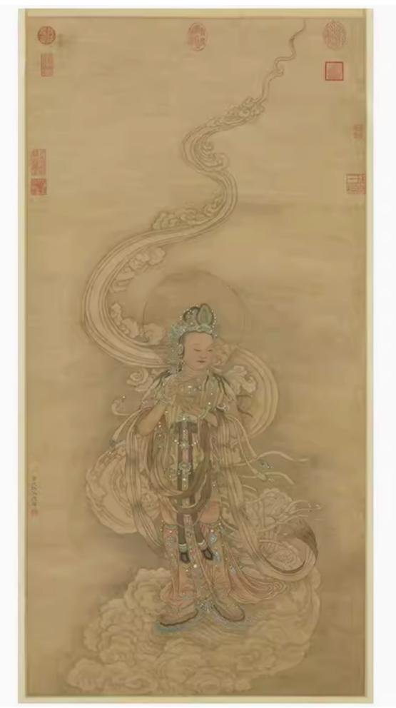 > 仏教美術 明 仇英 観世音菩薩 仏像 仏画 菩薩像 観音菩薩像 観音像 縦幅 絹布 絹本東洋画 中堂画 掛け物 未表装zhzx096