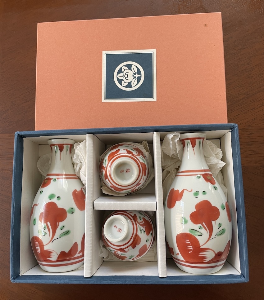 - たち吉 酒器揃え 赤絵 紅花 徳利2本 猪口5客 盃 お正月 箱入り