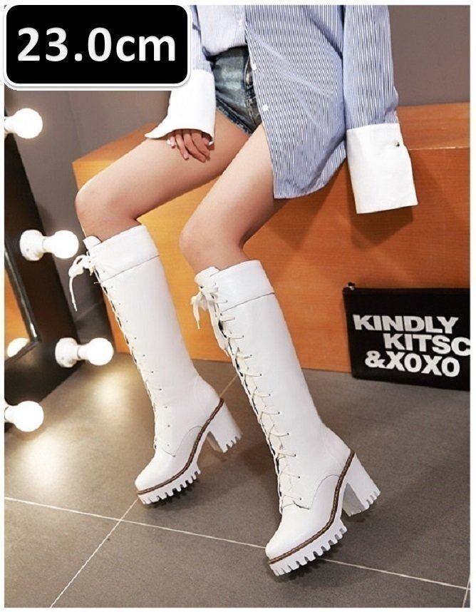 > 秋冬 フロック ニーハイブーツ ホワイト 23.0cm レースアップ ロングブーツ ハイヒール ブーツ 腿高 靴 美脚 新品 ☆197