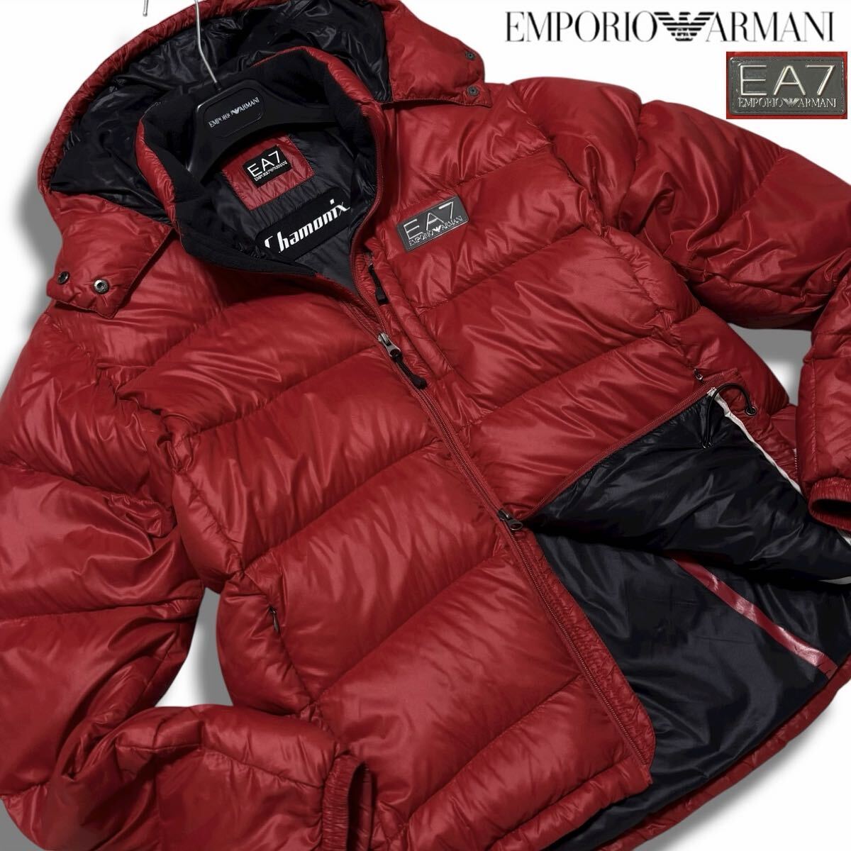 - 極美品/Lサイズ●エンポリオ アルマーニ 極暖 ダウンジャケット ブルゾン ダブルジップ 2WAY フード着脱 ロゴパッチ 赤 黒 EMPORIO ARMANI