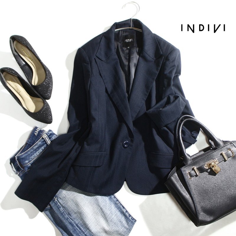 > 美品 INDIVI GALLEST インディヴィ 株) ワールド 通年 ピンストライプ 柄 テーラードジャケット 紺 ネイビー 11号 40 オフィス リクルート