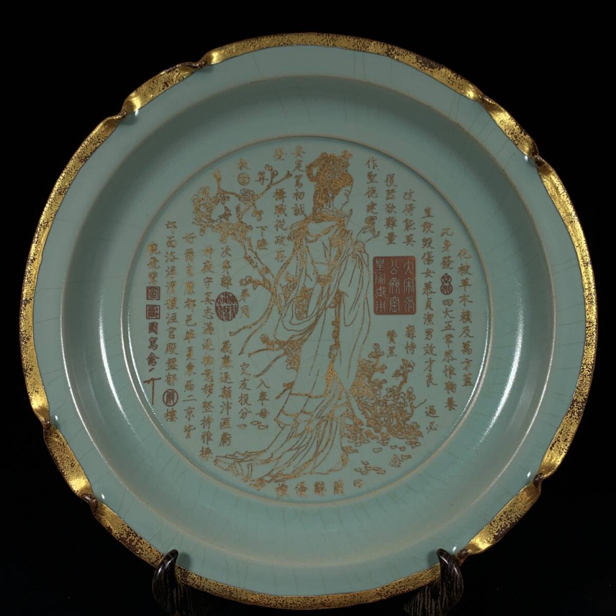 - 旧蔵 宋代 汝窯 銘文 仕女紋 花口盤 古陶瓷品 陶藝 古擺件 古置物 中国古玩 骨董品 時代物 稀少唐物