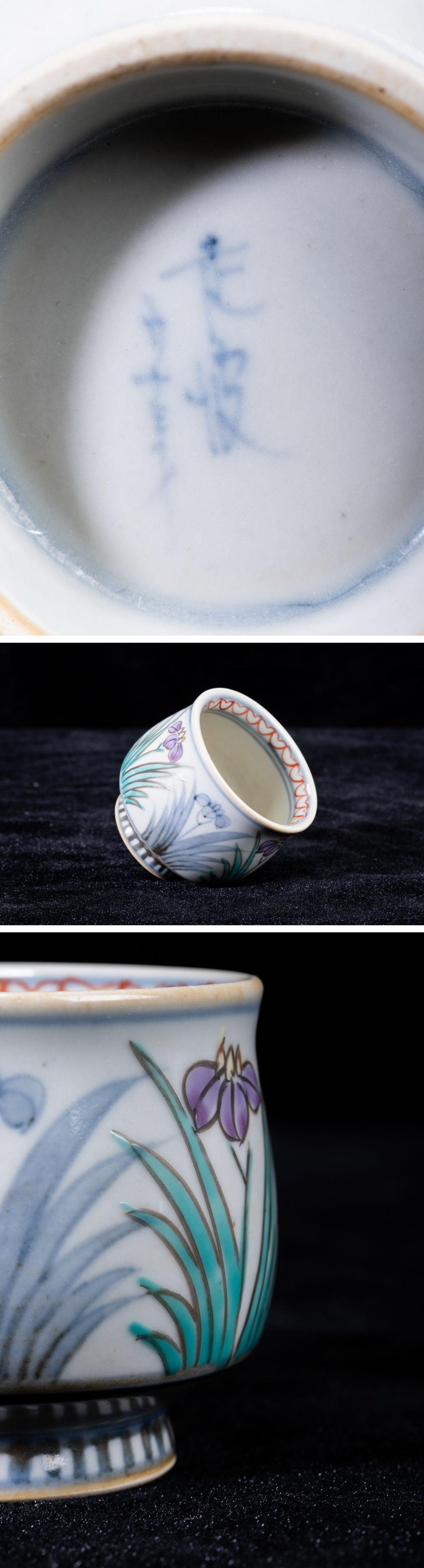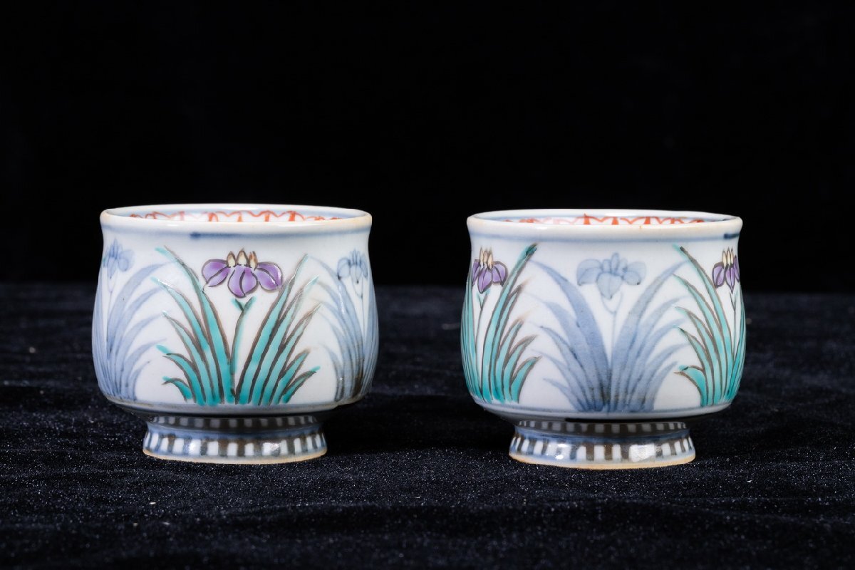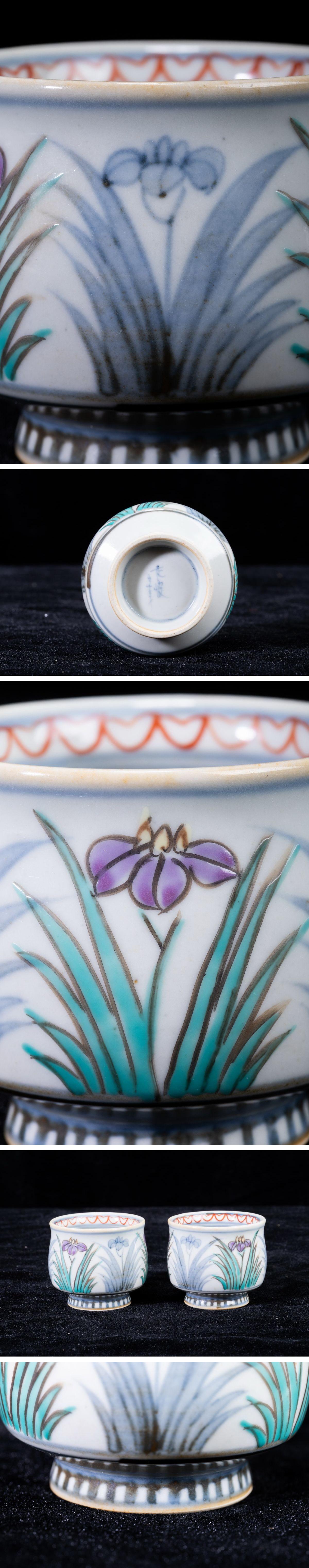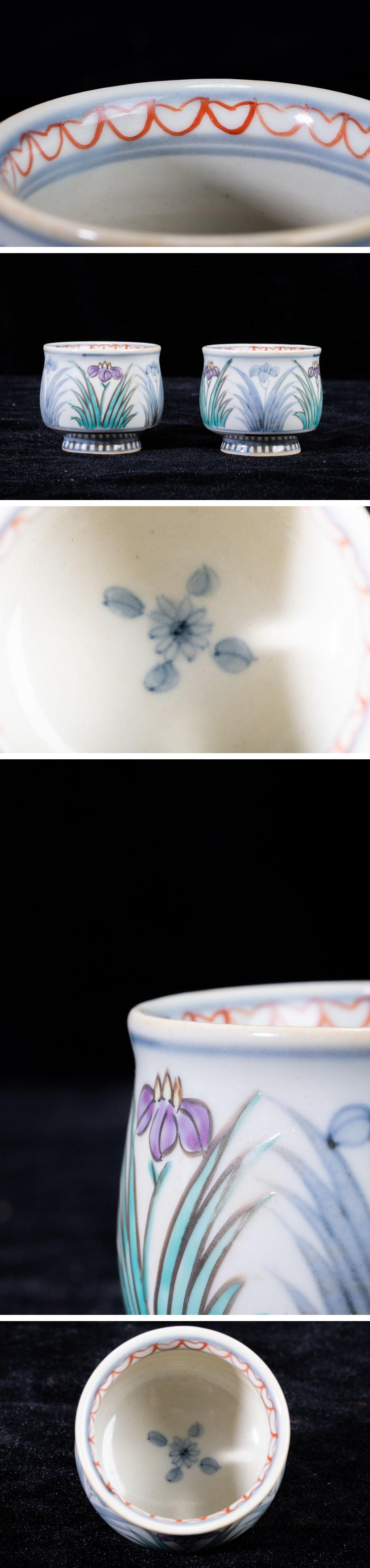 - 【珍品堂】1円から N66-V2 有田焼 佐藤走波 六十歳 在銘 花草文 染錦 名工 湯呑み 2客 高6㎝ 茶器 茶道具 煎茶道具 時代物 骨董品 古美術