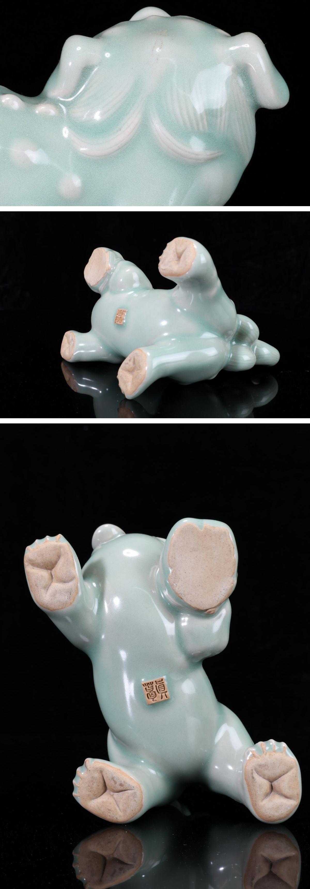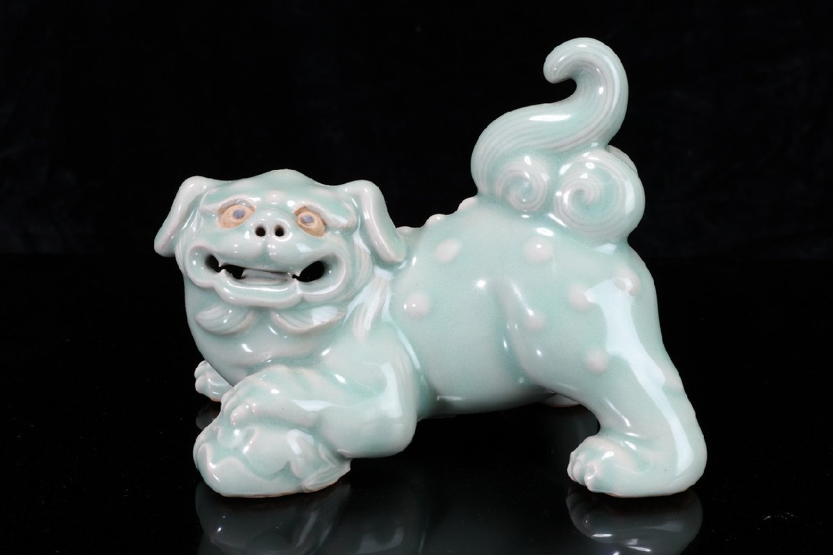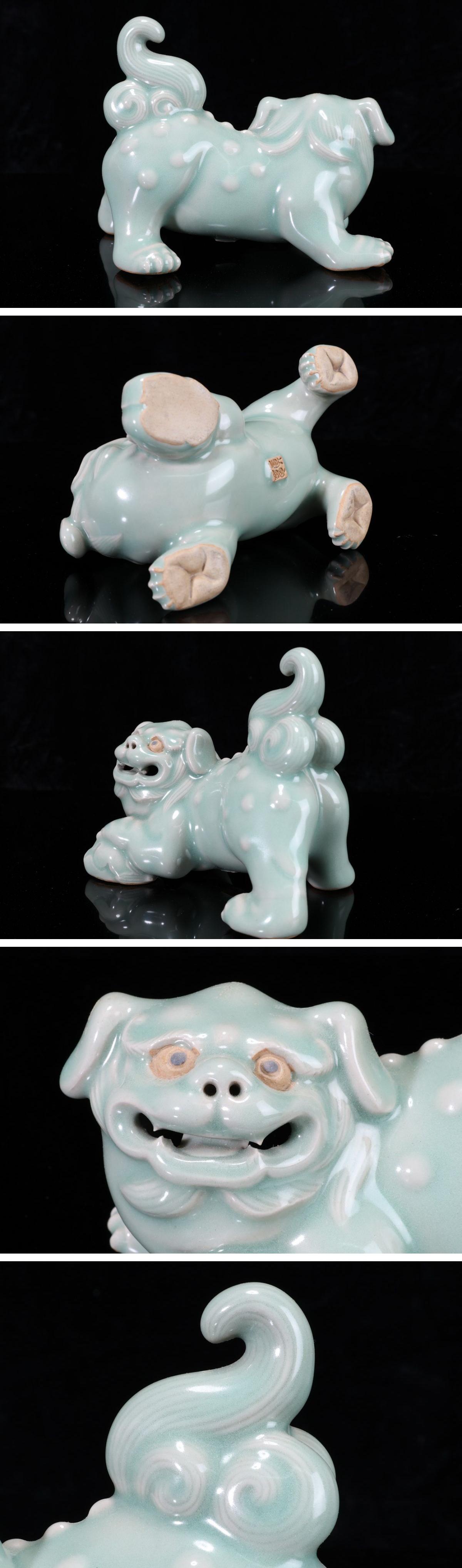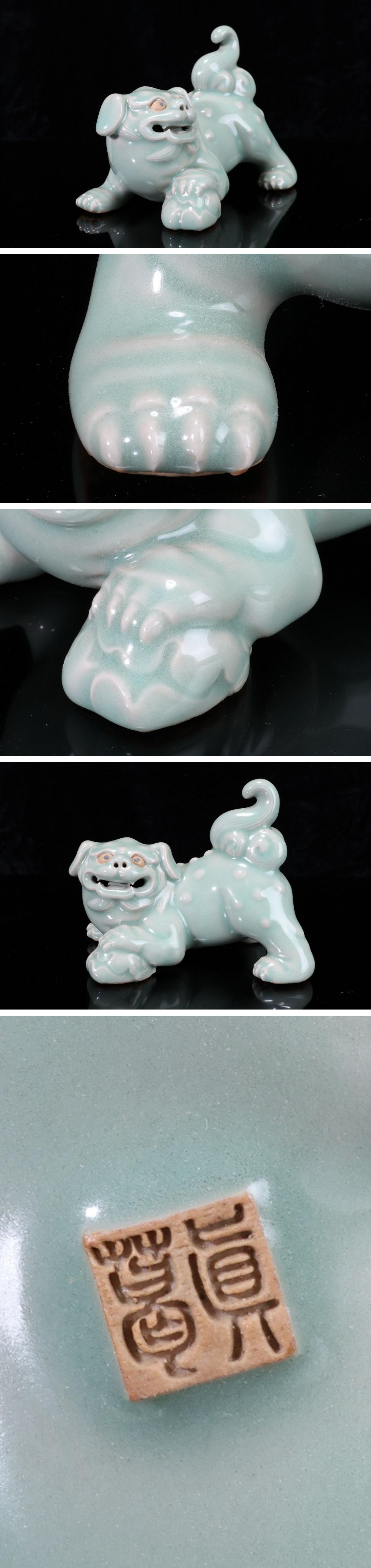 - 【珍品堂】1円から N74-V20 京焼 清水焼 青磁釉 真葛香山 作 在銘 細密彫刻 獅 高10.5㎝ 鑑賞品 コレクション 時代物 工芸品 骨董品 古美術