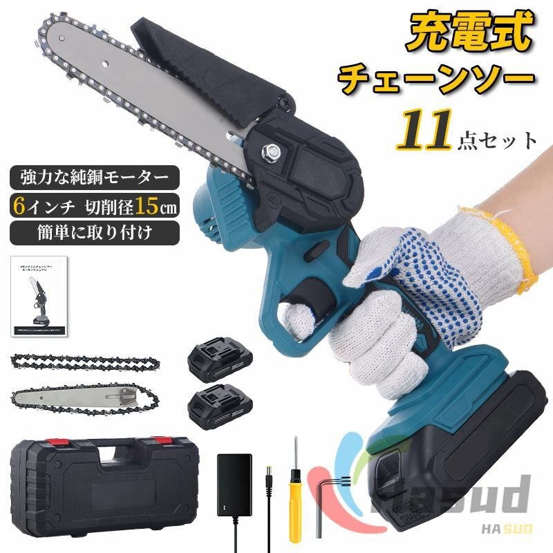 - チェーンソー 充電式 電動チェーンソー コードレス 6寸 6インチ 小型 21Vバッテリー互換対応 家庭用 強力 片手 軽量 木工切断 枝切り 伐採