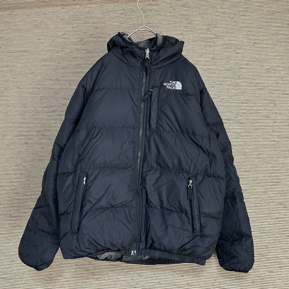 > ノースフェイス リバーシブルダウンジャケット 子供150US規格刺繍黒E2 古着 入手困難 激レア 人気 キッズ ワンポイントロゴ