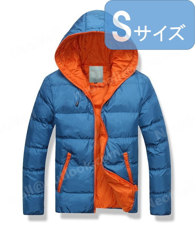 > フード付き メンズ ダウン 004 ブルー×オレンジ Sサイズ 中綿ダウン 中綿ベスト キルティング アウター 防寒 秋冬 暖かい