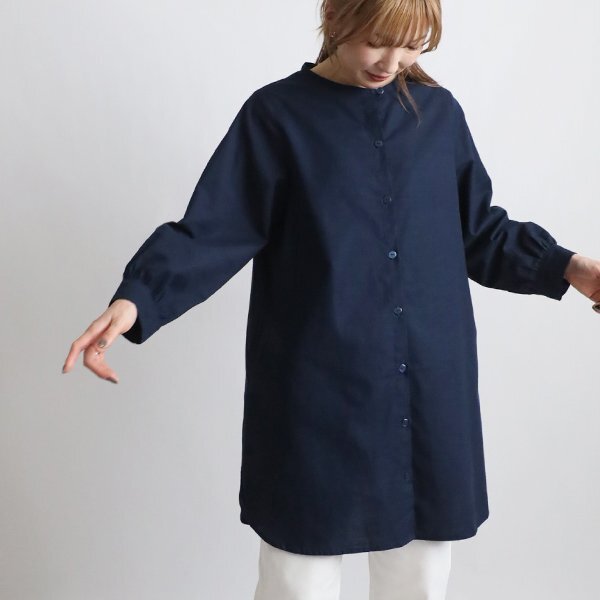 > ブラックフライデー1000円からスタート 上質ギマ擬麻コットンヘム ラウンド 裾 ロング シャツ 前開き 羽織り 紺ネイビー H97