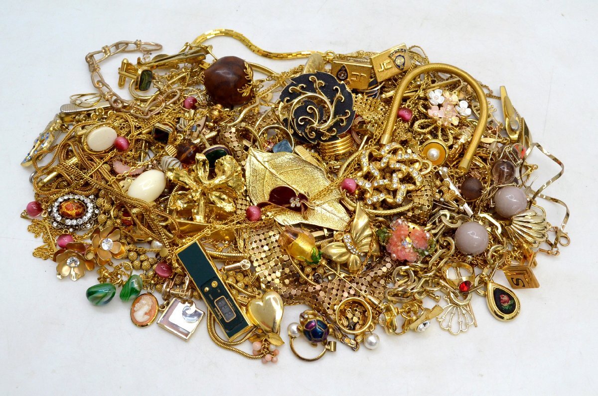 > アクセサリー ジャンク ネックレス ブローチ イヤリング ブレスレット 装飾品他 ゴールドカラー まとめ 約1kg [fui]