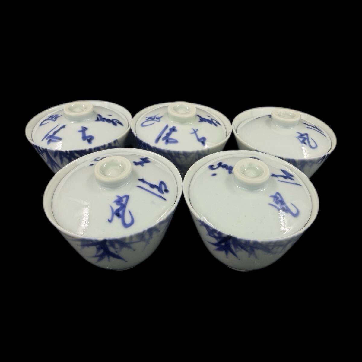 > [葉]805煎茶道具 京焼 村田亀水 染付 笹文 啜茶碗 煎茶碗 蓋茶碗 五客 花押 在銘 合わせ箱 保証品