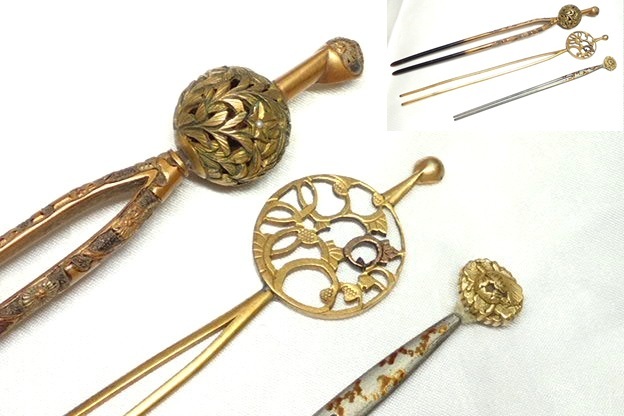 - 11256[M]時代物 和装小物 頭道具 3本セット♪髪飾り 簪 かんざし 着物 (検)透かし細工 平打ち 玉かんざし レトロ アンティーク♪