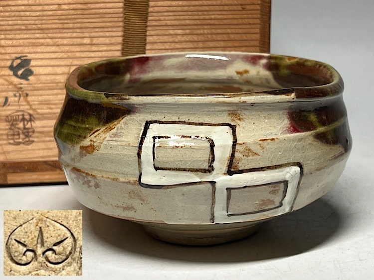 - 【瑞】加藤春二造 竹里庵 葵窯 織部 茶碗 共箱 共布 栞