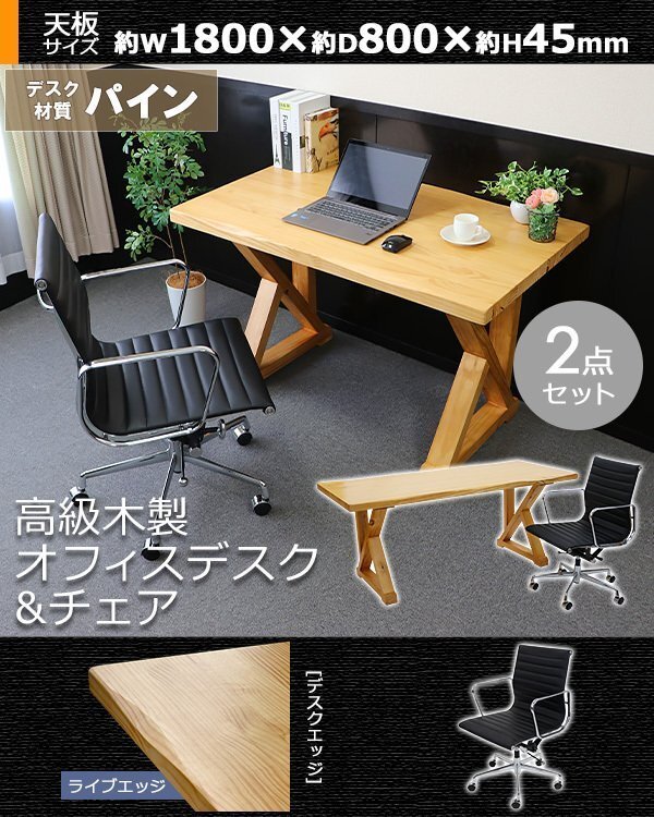- 送料無料 オフィスデスク アルミナムチェア 2点セット ライブエッジ 約W1800×約D800×約H750mm オフィステーブル パイン材 おしゃれ