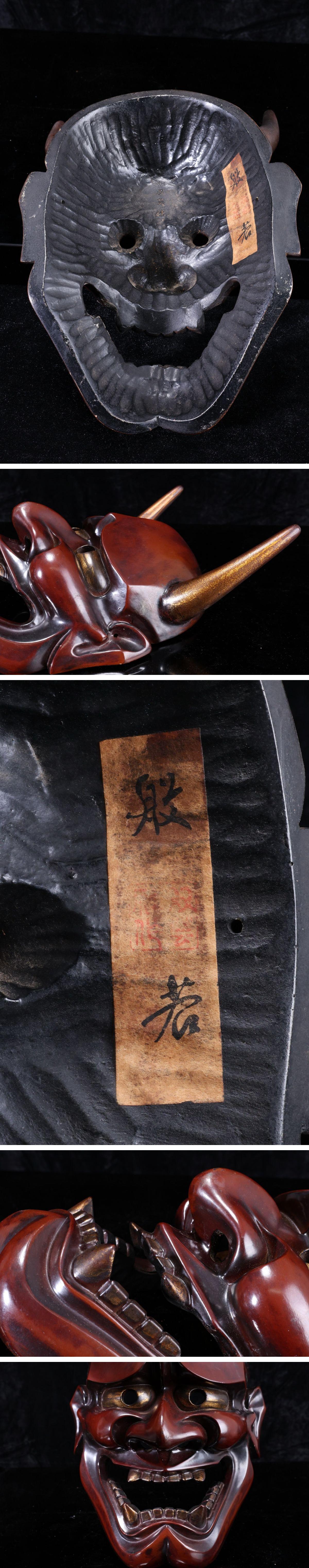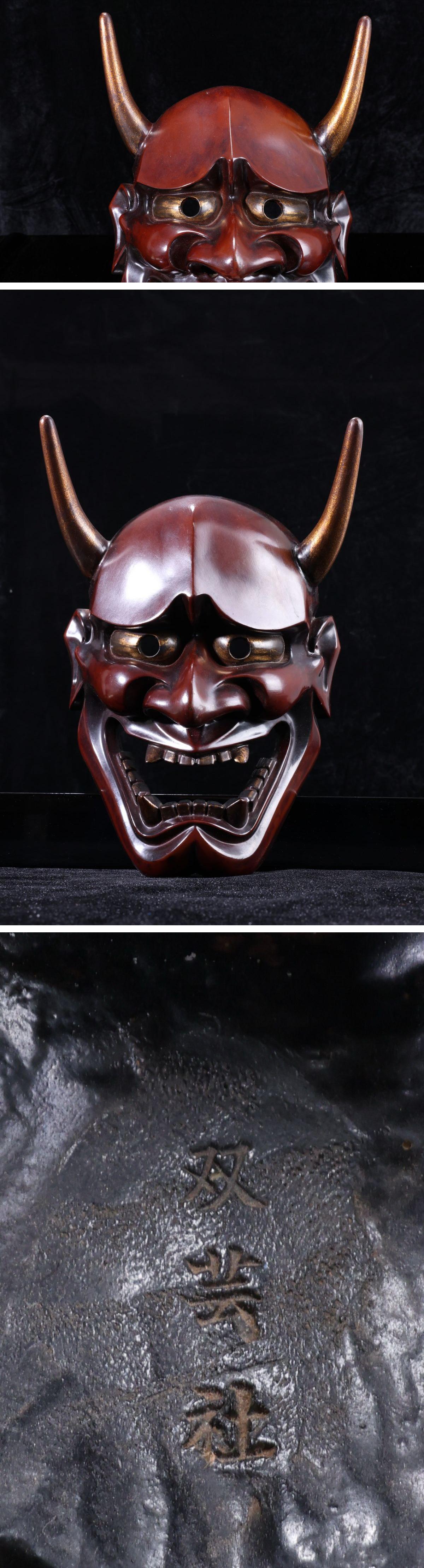 > 【珍品堂】1円から Q32-V12 双藝社 お面 能面 神楽面 飾り面 細密彫刻 般若 高8㎝ 歌舞伎 縁起物 魔除け 伝統工芸品 時代物 骨董品 古美術