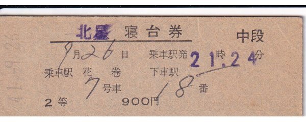 - 鉄道切符 硬券 北星 寝台券(2等) 花巻から