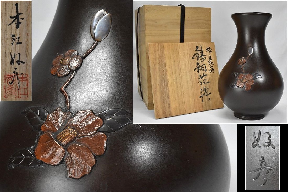 【本江好彦(鶴峰)】通産大臣指定 伝統工芸品 椿文象嵌 銅製 盛上 花瓶 高さ31cm 共箱 栞付
