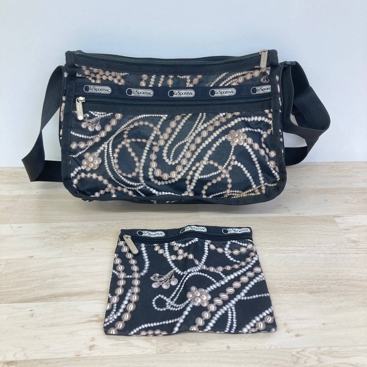 - 美品 LESPORTSAC レスポートサック ショルダーバッグ/ポーチ 2点セット パール柄 ブラック/黒/総柄 ナイロン[OC02511]