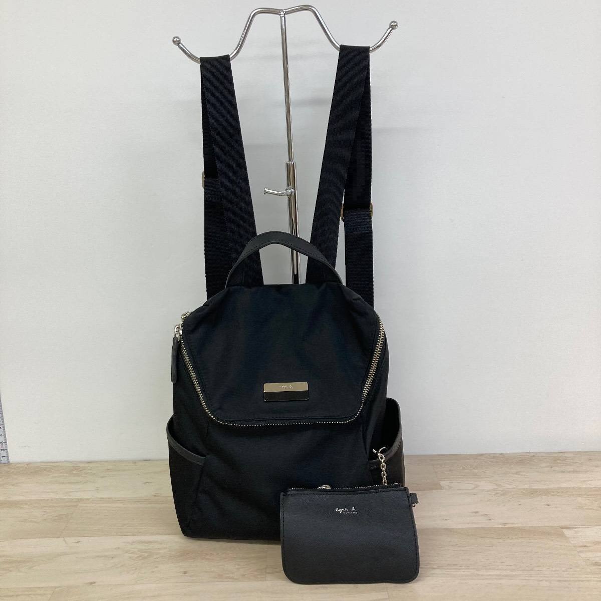 > 美品 agnes b. VOYAGE/アニエスベーボヤージュ リュックサック/バックパック ポーチ付き ブラック/黒 ナイロン/メタルプレート[OR02321]