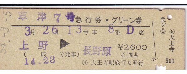 - 鉄道切符 硬券 国鉄 草津 急行券・グリーン券 上野→長野原