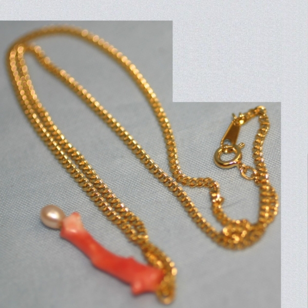 - 人気のピンク系縦長サンゴにパ-ル付トップ金色チェ-ンネックレス ○B9-