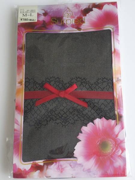 - 新品未使用★赤いリボン付き足首レース柄タイツ★黒・M~L