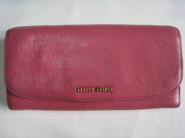 > $ 良好品 $ 希少 ◆ ミュウミュウ ◆ miumiu ◆ マドラス レザー素材 ・ 長財布 ◆ ベリーピンク系 ◆ 送料無料!!