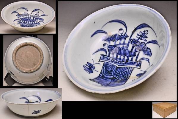 - 時代 ★ 古染付花紋鉢 ★ 木箱 ★ 検 蓮花文 青花明末 清朝初期★
