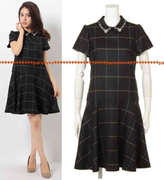 - 新品紙タグ付*美人百花掲載*レストローズ*ビジュー襟 ボタニー チェック ワンピース 黒MT