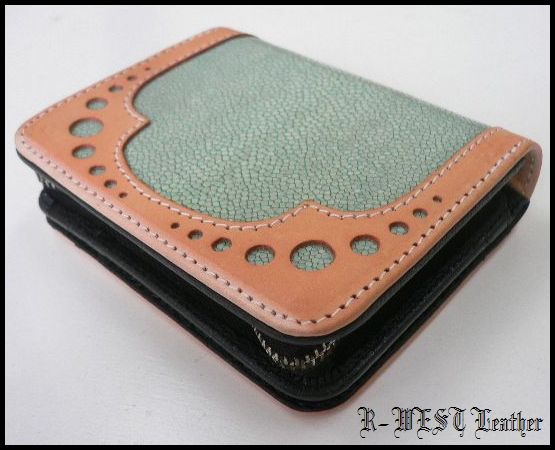 - 牛革×エイ革スティングレイ[カッティング]レザーウォレット グリーン×ヌメ/ショートtype革財布